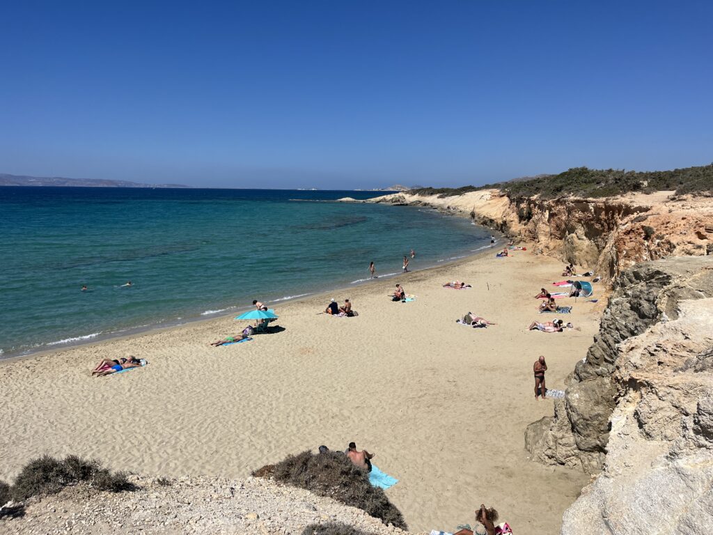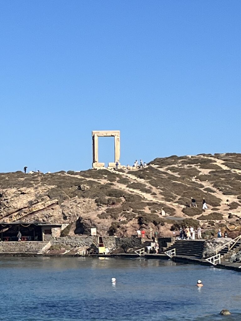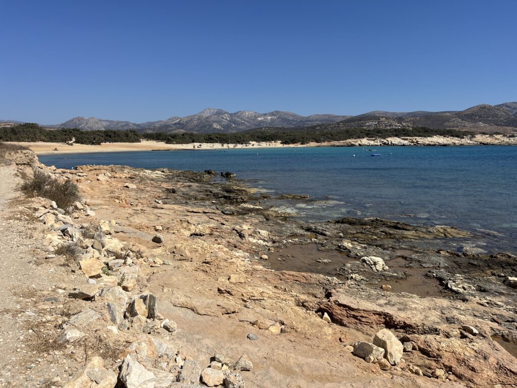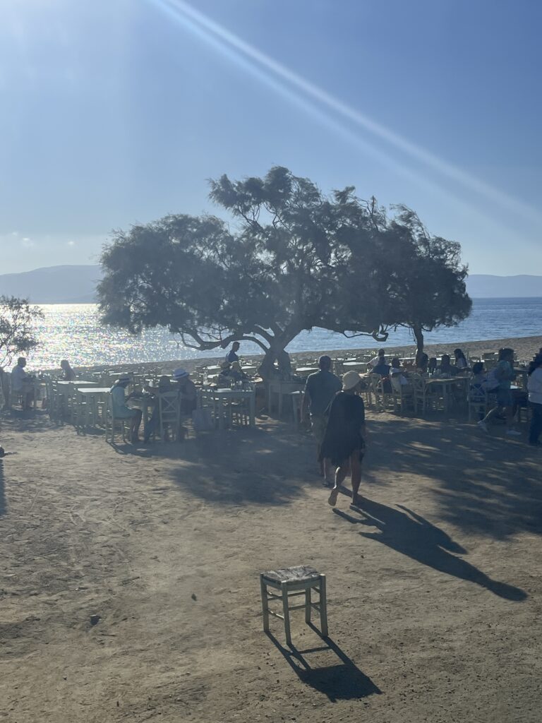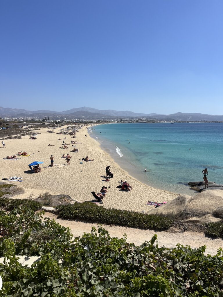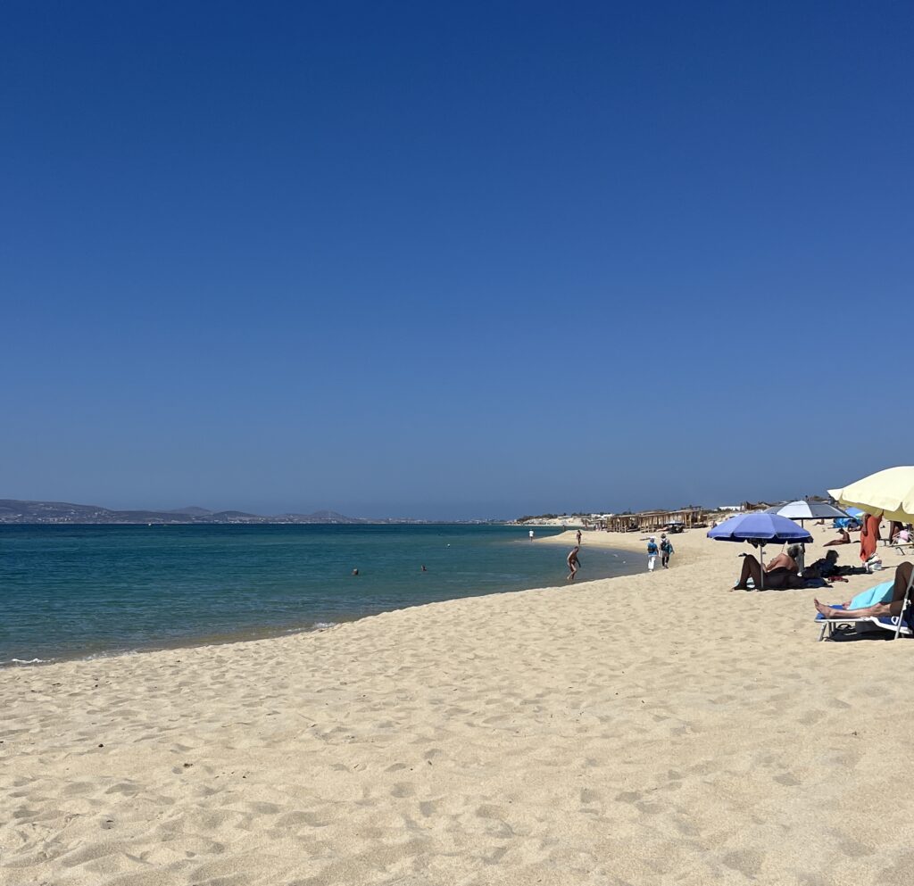 Day 2 in Naxos we decided not hire a car here and try out the buses instead. A pretty chaotic bus terminal near the port but managed to get on a bus to Agios Prokopois beach. It’s a wonderful long sandy beach, different to beaches we’ve been to so far. Water is stunning and there is a fabulous taverna at the far end with views to die for. A great day of sunshine and sea.