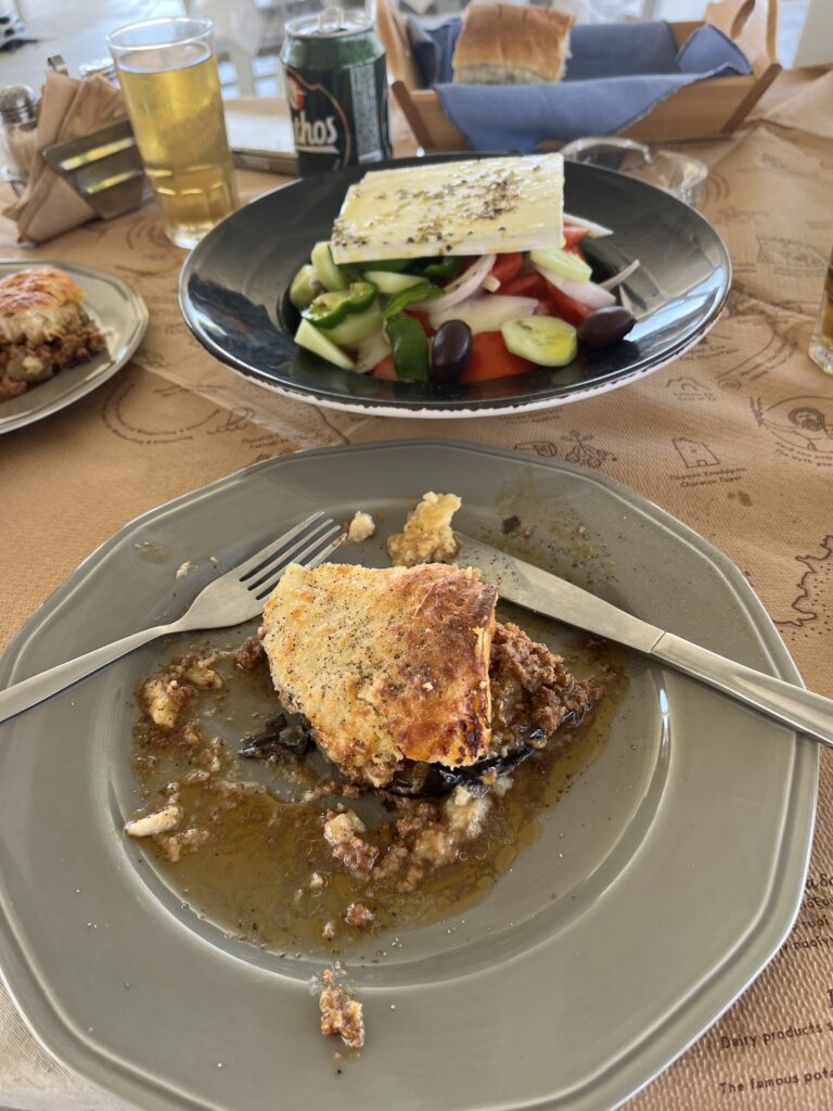 Day 3 it was another bus trip to Plaka beach, a bit further down from yesterday. The buses are pretty good to be fair, and quite cheap as you would expect. Plaka beach is the longest stretch of sand on the island, and it was a beauty. Good mix of sunbeds and large sandy areas where you can just put your towel down, another skinny dip area as there was plenty of nudists enjoying the beach. We also had a very nice little lunch break at a taverna called Maistrali. They serve lovely home cooked greek dishes. We shared a moussaka and a greek salad, lovely, plus a carafe of local rose wine.