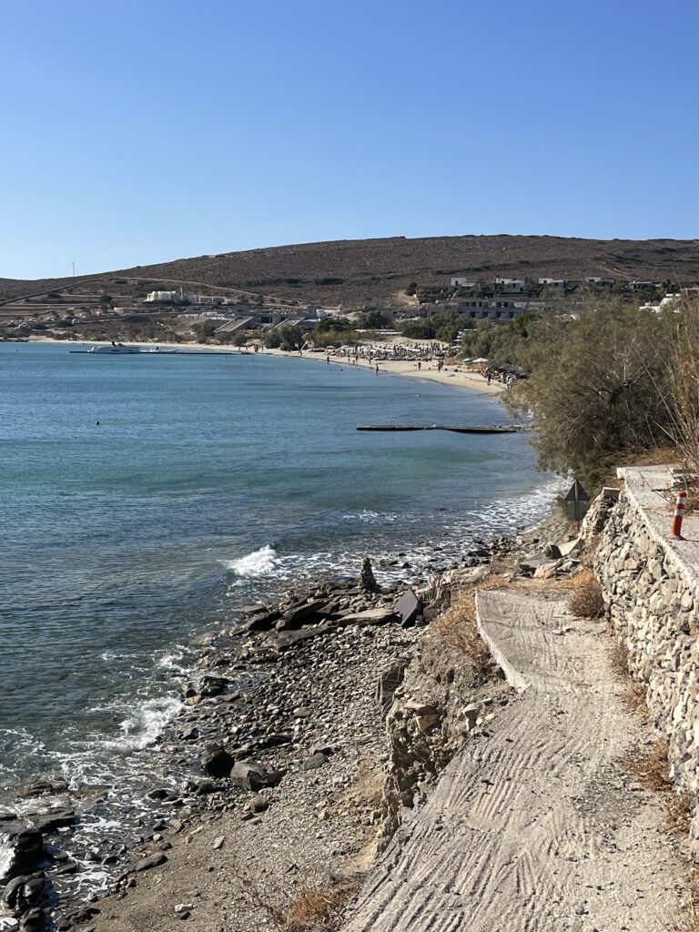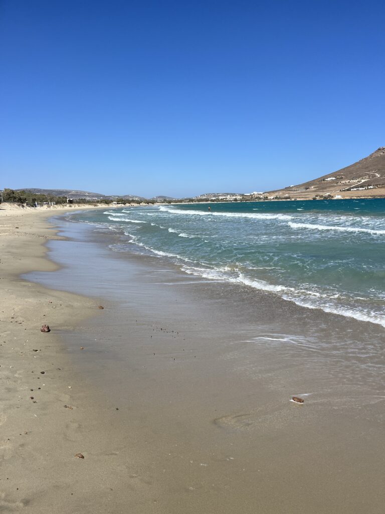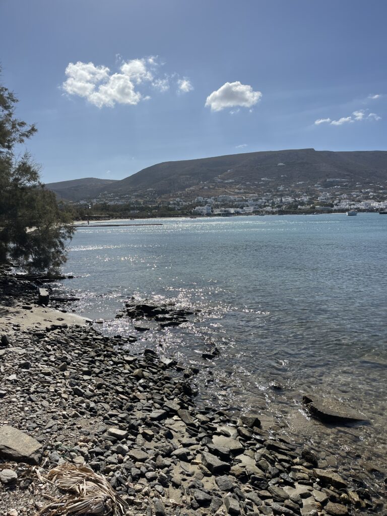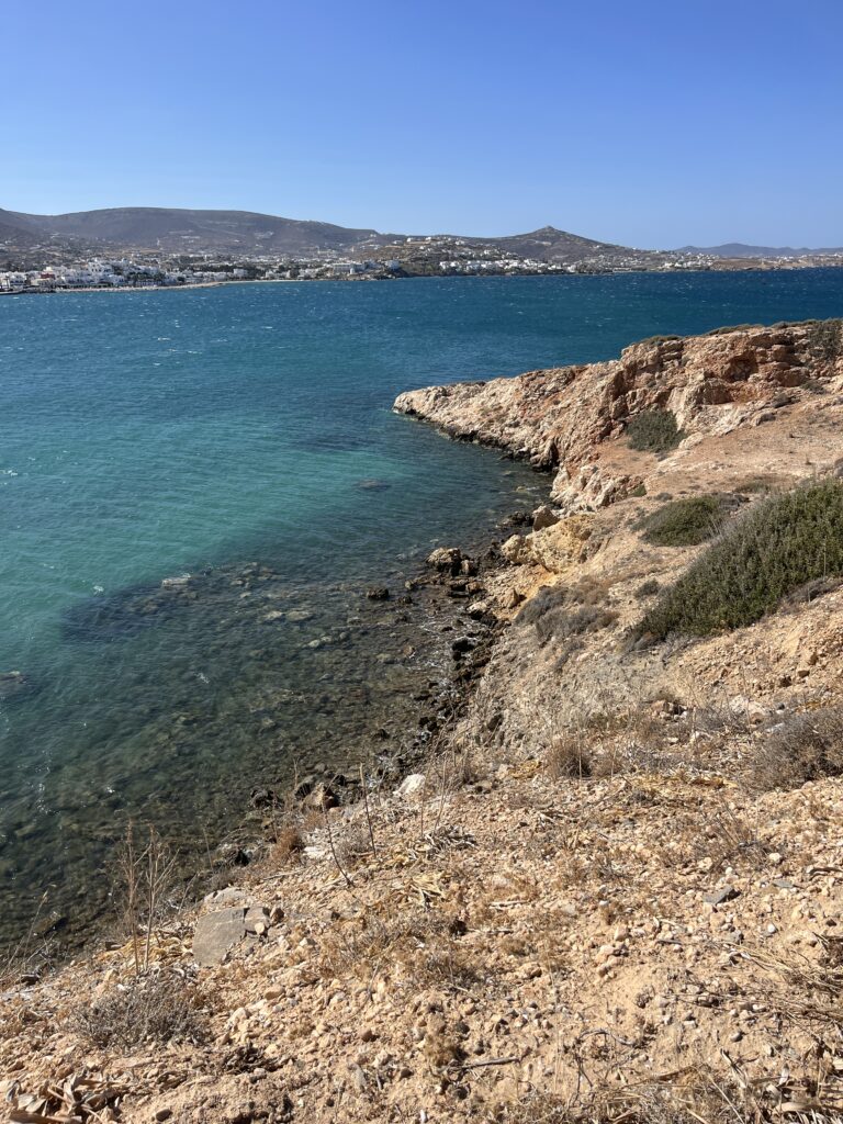 On our last day in Paros the wind did not relent so we planned on getting a little ferry boat across the port to a beach called Krios, which is protected from the north winds. However the ferry wasn’t running due to the weather so we walked round which took about an hour. Lovely easy walk with some great views and it was worthwhile because the beach was lovely.